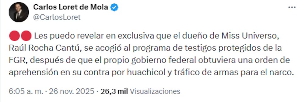 «El dueño del Miss Universo se acogió al programa de testigos protegidos de la FGR, después de que el propio gobierno federal obtuviera una orden de aprehensión en su contra por huachicol y tráfico de armas para el narco», precisó.