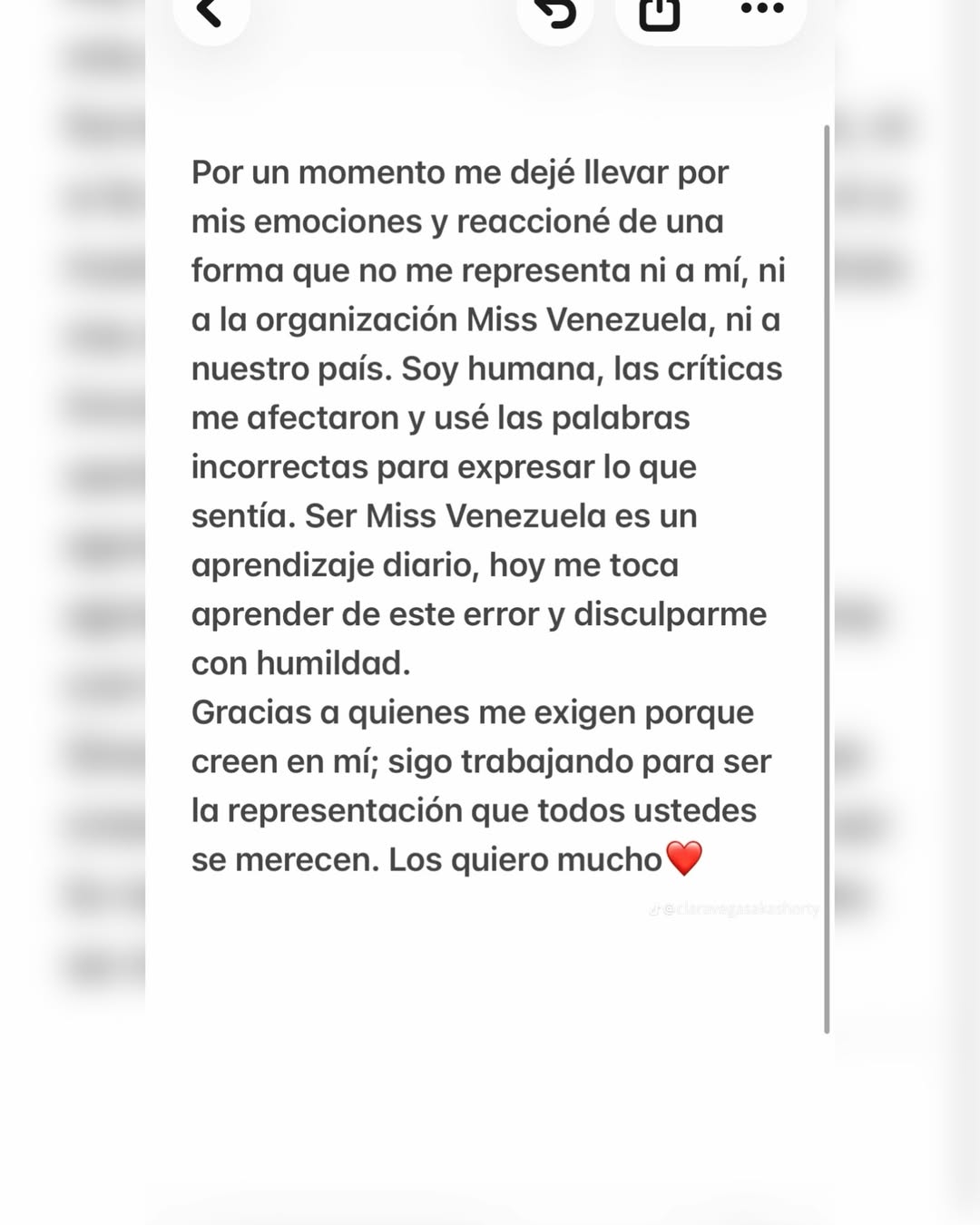 «Soy humana, las críticas me afectaron y usé las palabras incorrectas para expresar lo que sentía. Ser Miss Venezuela es un aprendizaje diario, hoy me toca aprender de este error y disculparme con humildad», añadió.