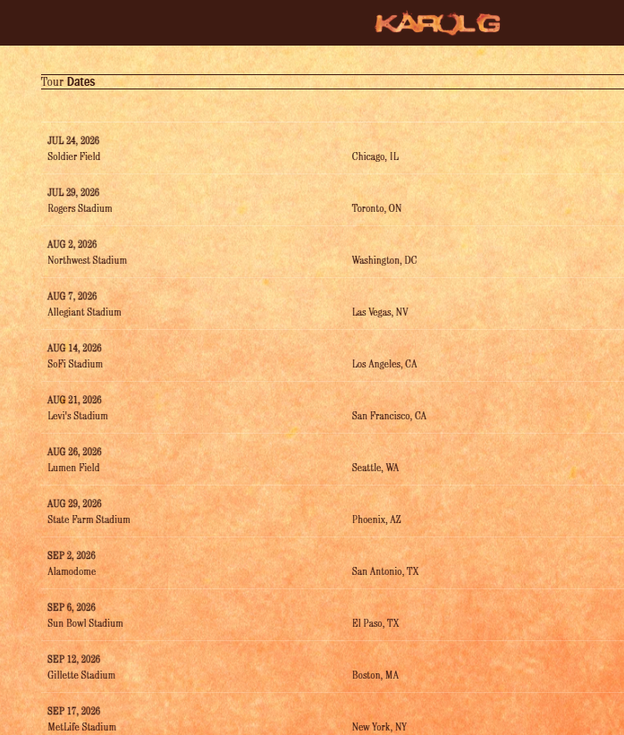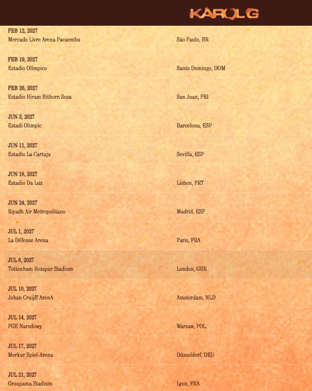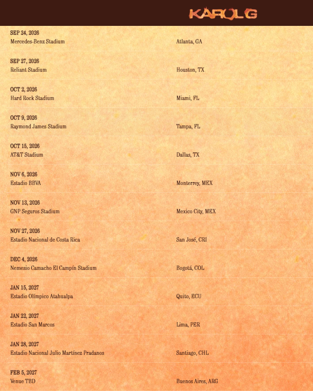 Karol G viajará después a Latinoamérica, donde se presentará antes de finalizar el año en Monterrey, Ciudad de México, San José, Bogotá, Quito, Lima, Santiago, Buenos Aires, Sao Paulo y San Juan, entre el 5 de noviembre y el 26 de febrero de 2027.