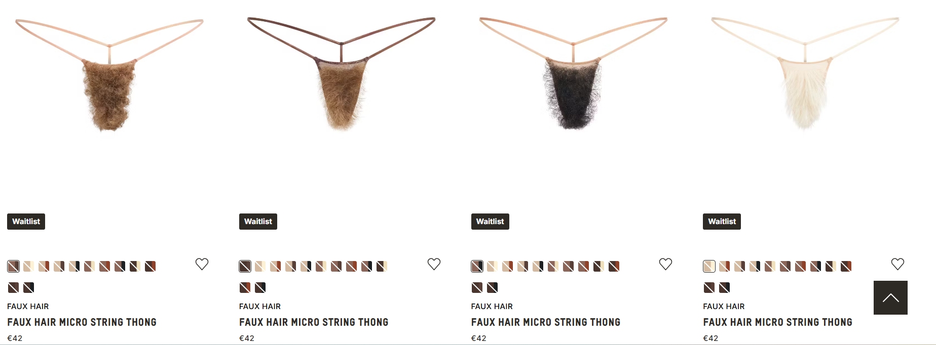«Nuestra braguita más atrevida hasta la fecha. Hecha a mano en malla elástica supertransparente, esta tanga presenta una mezcla de pelo sintético rizado y liso en doce tonos diferentes. Incluye tiras laterales elásticas», indicó SKIMS.