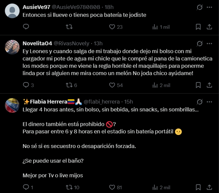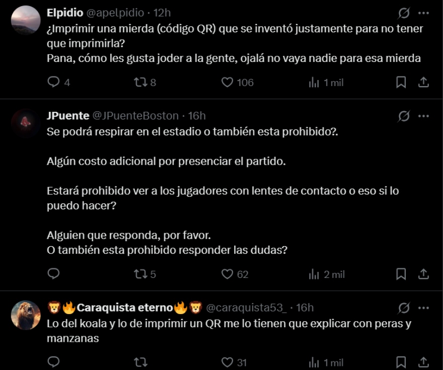 Varios de los fanáticos advirtieron que los trabajadores o motorizados tendrán dificultades para ir al estadio, ante la prohibición de bolsos y cascos. A esto se suman las críticas por la obligatoriedad de llevar impreso el QR.