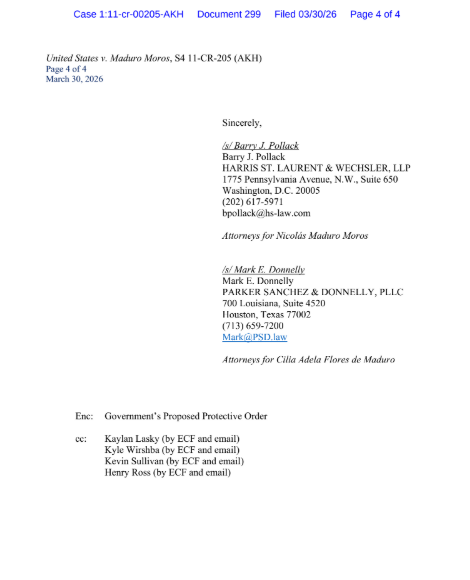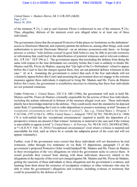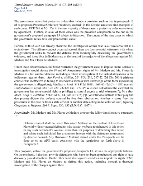 Sin embargo, los juristas argumentan que, dado que la fiscalía pretende responsabilizar a Maduro y Flores por acciones atribuidas a estos cuatro coacusados, impedir cualquier contacto con ellos para discutir pruebas o preparar deposiciones bajo la Regla 15 constituye una violación a la Quinta y Sexta Enmienda, que garantizan el debido proceso y el derecho a una defensa justa.