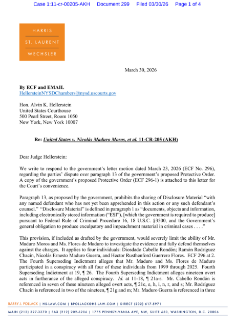 La defensa de Nicolás Maduro y Cilia Flores abrió un nuevo frente en el proceso judicial que enfrentan en Nueva York, al solicitar al juez Alvin Hellerstein que rechace una disposición de la fiscalía que impide compartir evidencias con coacusados que permanecen en libertad.