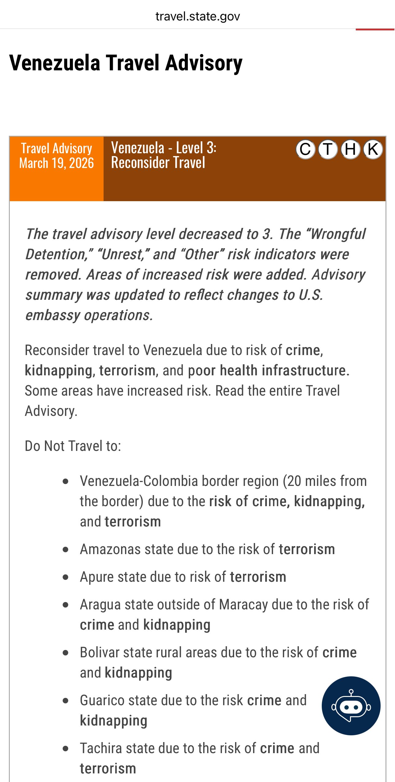 EE.UU. incrementó el pasado diciembre la alerta de viaje para Venezuela a la categoría 4 (No viajar), un nivel que aún así el Departamento de Estado estadounidense va a mantener activado en estados como Táchira, Amazonas, Apure, Aragua y Guárico o las zonas rurales de Bolívar «debido al riesgo de delincuencia, secuestro y terrorismo».