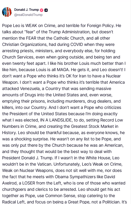 «Y no quiero un papa que critique al Presidente de los Estados Unidos porque estoy haciendo exactamente por lo que me eligieron, por una aplastante mayoría, estableciendo cifras récord de delincuencia y creando el mejor mercado de valores de la historia. León debería estar agradecido porque, como todos saben, fue una sorpresa mayúscula», sostuvo.