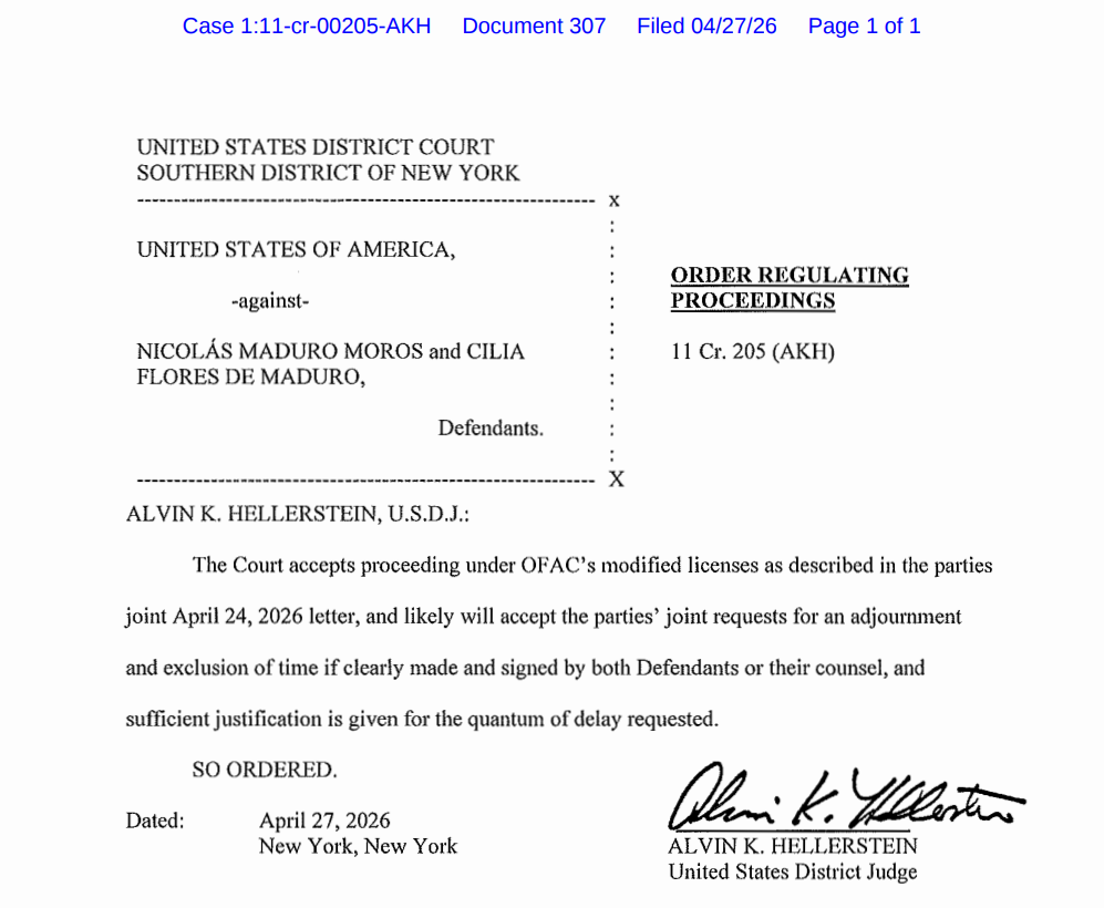 La modificación fue notificada al tribunal en una carta conjunta enviada el viernes por fiscales federales y la defensa, donde se informó que el Tesoro ajustó la licencia para permitir que Venezuela pague los honorarios legales de Maduro y de su esposa, Cilia Flores, bajo condiciones estrictas.