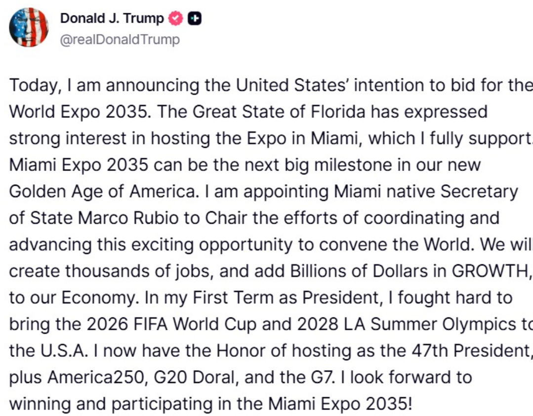 «Estoy nombrando al secretario de Estado, oriundo de Miami, Marco Rubio, para que presida los esfuerzos de coordinación y avance de esta emocionante oportunidad de reunir al mundo. Crearemos miles de empleos y añadiremos miles de millones de dólares en crecimiento a nuestra economía. En mi primer mandato como presidente, luché arduamente para traer el Mundial de la FIFA 2026 y los Juegos Olímpicos de Verano de Los Ángeles 2028 a Estados Unidos. Ahora tengo el honor de ejercer como el 47.º presidente, además de America250, el G20 en Doral y el G7. ¡Espero con entusiasmo ganar y participar en la Expo Miami 2035!», agregó el republicano.