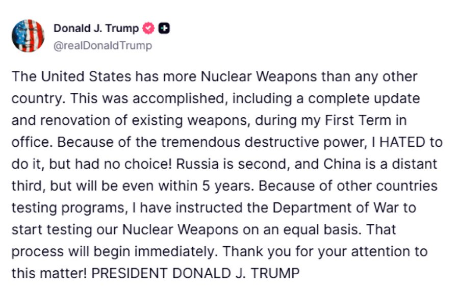 No obstante, ante las pruebas que están llevando a cabo otros países anunció que comenzarán con la activación. «Debido a los programas de pruebas de otros países, he instruido al Departamento de Guerra para que inicie las pruebas de nuestras armas nucleares en igualdad de condiciones».