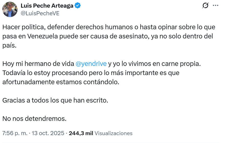 «Hacer política, defender derechos humanos o hasta opinar sobre lo que pasa en Venezuela puede ser causa de asesinato, ya no solo dentro del país», indicó.