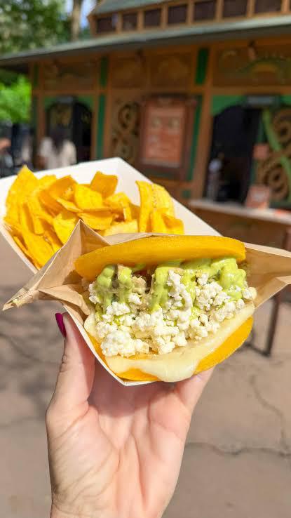 «No soy una experta en arepas, pero esta sin duda tiene su propio toque Disney: la arepa en sí es suave y ligeramente dulce, no como las tradicionales, ¡pero la combinación de sabores funciona muy bien! El pollo estaba delicioso, el aderezo de aguacate le daba un toque especial y los chips de plátano eran súper crujientes y deliciosos», se describe.