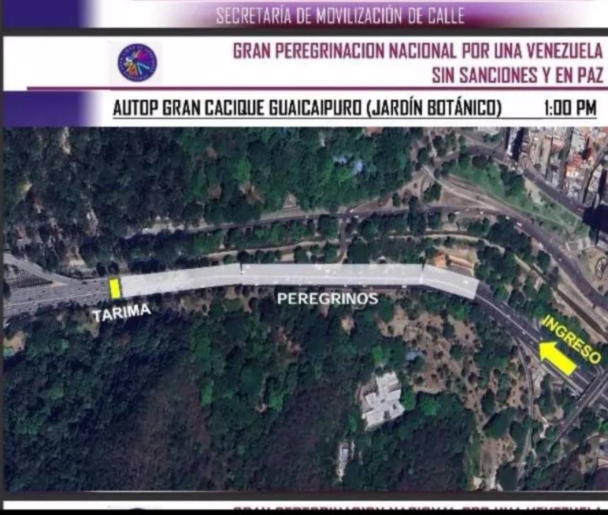 El oficialismo convocó para este jueves a una actividad como parte del cierre de la peregrinación por la paz y el levantamiento de sanciones que se llevará a cabo en la autopista Gran Cacique Guaicaipuro. El punto donde convergerán las tres caravanas encabezadas por Delcy Rodríguez; el presidente de la Asamblea Nacional, Jorge Rodríguez, y el ministro de Interior, Justicia y Paz, Diosdado Cabello, será a la altura del Jardín Botánico.