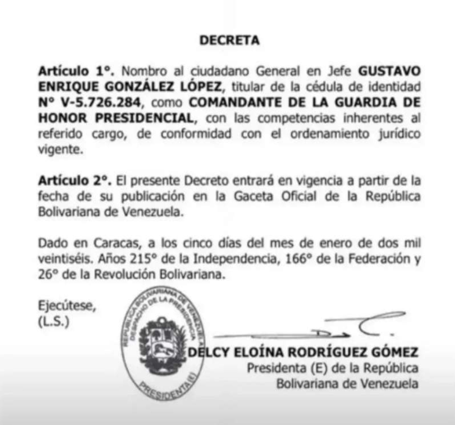 La Gaceta Oficial estableció que González tomará el cargo desde la propia publicación del decreto. El general en jefe, de la rama del Ejército Bolivariano, formalizó el cargo y se encargará de la protección de Delcy Rodríguez.