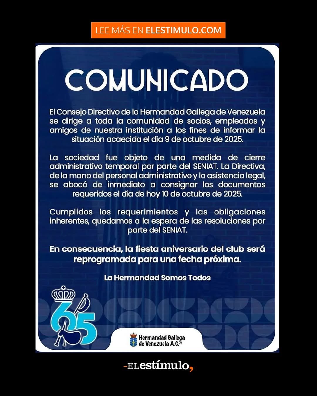 En la misiva emitida por la directiva del club social, dos días después del cierre, se aseguró que la administración de la Hermandad recopiló la documentación requerida por la autoridad fiscal venezolana el día siguiente a la inspección.