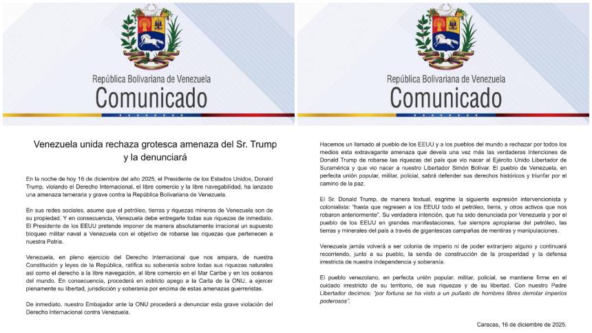 «Violando el Derecho Internacional, el libre comercio y la libre navegabilidad, ha lanzado una amenaza temeraria y grave contra la República Bolivariana de Venezuela», reaccionaron en un comunicado conjunto publicado por la vicepresidenta, Delcy Rodríguez y el canciller, Yván Gil.