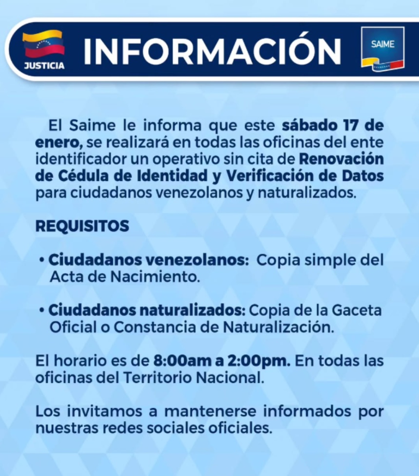 «El Saime le informa que (…) se realizará en todas las oficinas del territorio nacional una jornada sin cita de cedulación y verificación de datos para ciudadanos venezolanos y naturalizados», detalló el organismo.